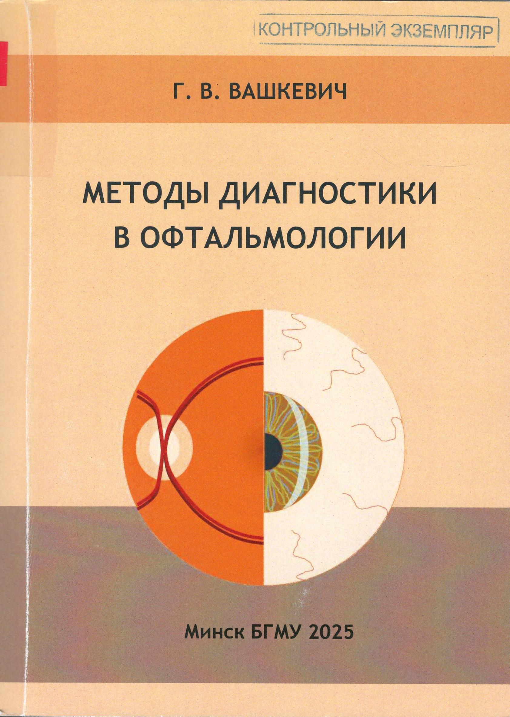 Вашкевич, Г. В. Методы диагностики в офтальмологии : учебное пособие : допущено Министерством образования Республики Беларусь для слушателей системы дополнительного образования взрослых по направлению образования "Здравоохранение" / Г. В. Вашкевич ; Министерство здравоохранения Республики Беларусь, Белорусский государственный медицинский университет, Институт повышения квалификации и переподготовки кадров здравоохранения, Кафедра офтальмологии. – Минск : БГМУ, 2025. – 181, [1] с. : табл., цв. рис. – Библиогр.: с. 179-180. – ISBN 978-985-21-2130-9.